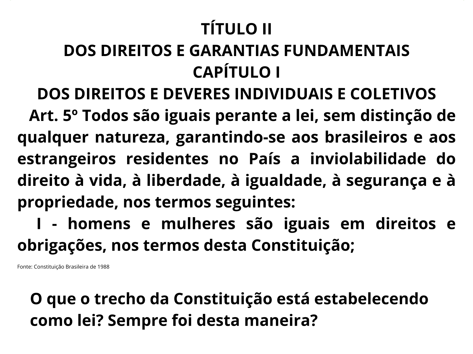 De acordo com o título ii da constituição federal (dos direitos e garantias fundamentais) no seu capítulo l (dos direitos e deveres individuais e artigo 5 da constituição federal. O artigo 5º da constituição federal trata da igualdade, deveres e direitos que temos como cidadãos dessa federação.